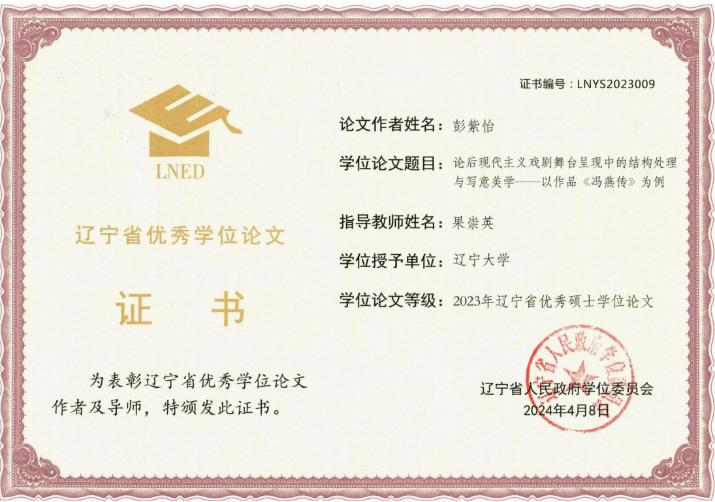 日前,辽宁省教育厅下发《关于公布2023年辽宁省优秀博士、硕士学位论文评选结果的通知》(辽教通〔2024〕4号),其中公司果崇英老师指导的戏剧专业硕士研究生毕业论文《论后现代主义戏剧舞台呈现中的结构处理与写意美学——以作品<冯燕传>为例》获得辽宁省优秀硕士学位论文。