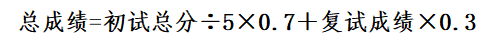 复试成绩和初试成绩按权重相加,得出招生考试总成绩。初试成绩占总成绩70%,复试成绩占总成绩30%。具体计算方法如下: